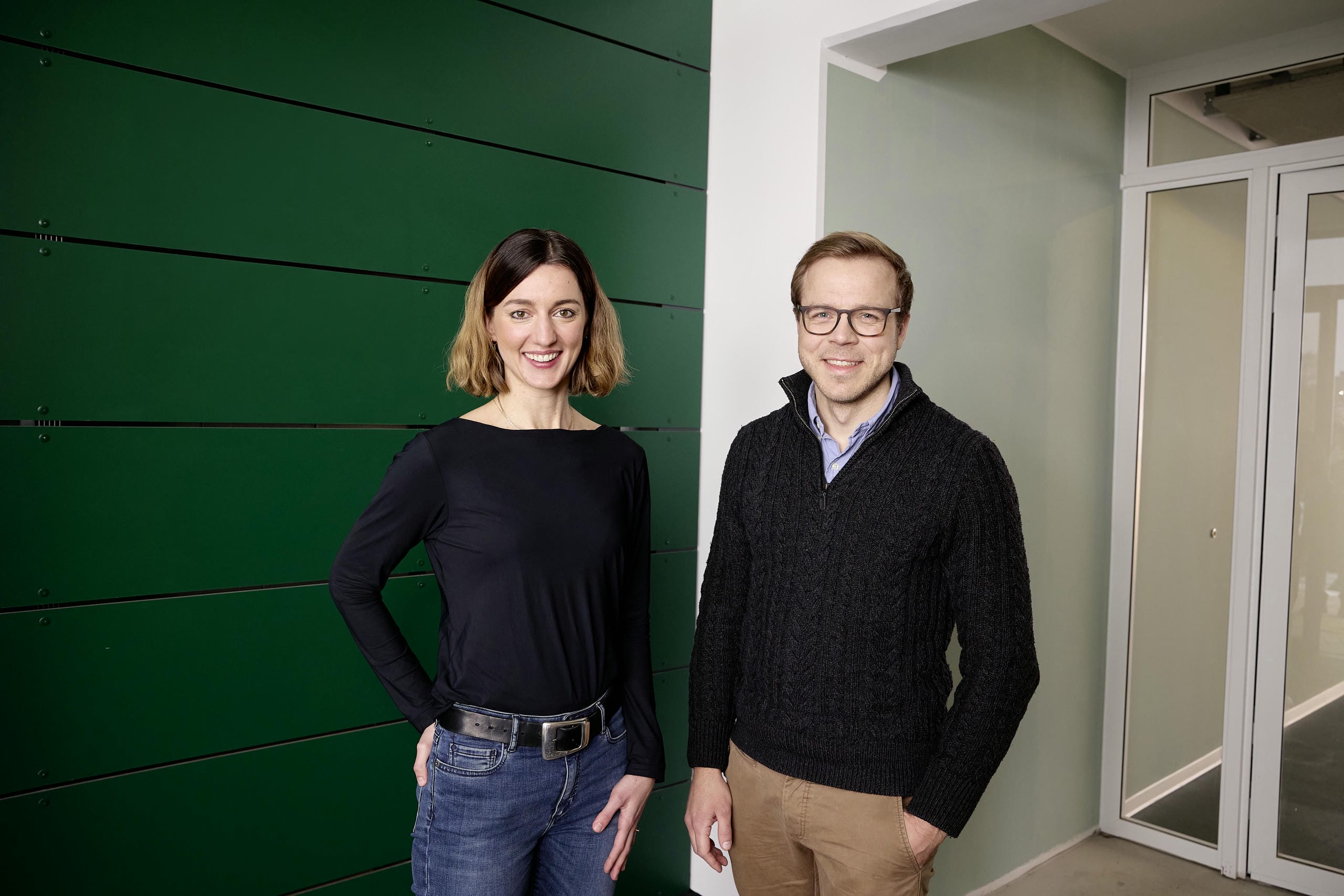 Zwei Personen stehen nebeneinander in einem modernen Innenraum; links eine Frau mit schulterlangem Haar, schwarzem Langarmshirt und Jeans vor einer grünen Wand, rechts ein Mann mit Brille, dunklem Pullover und beiger Hose vor einer Glastür; beide blicken lächelnd in die Kamera.