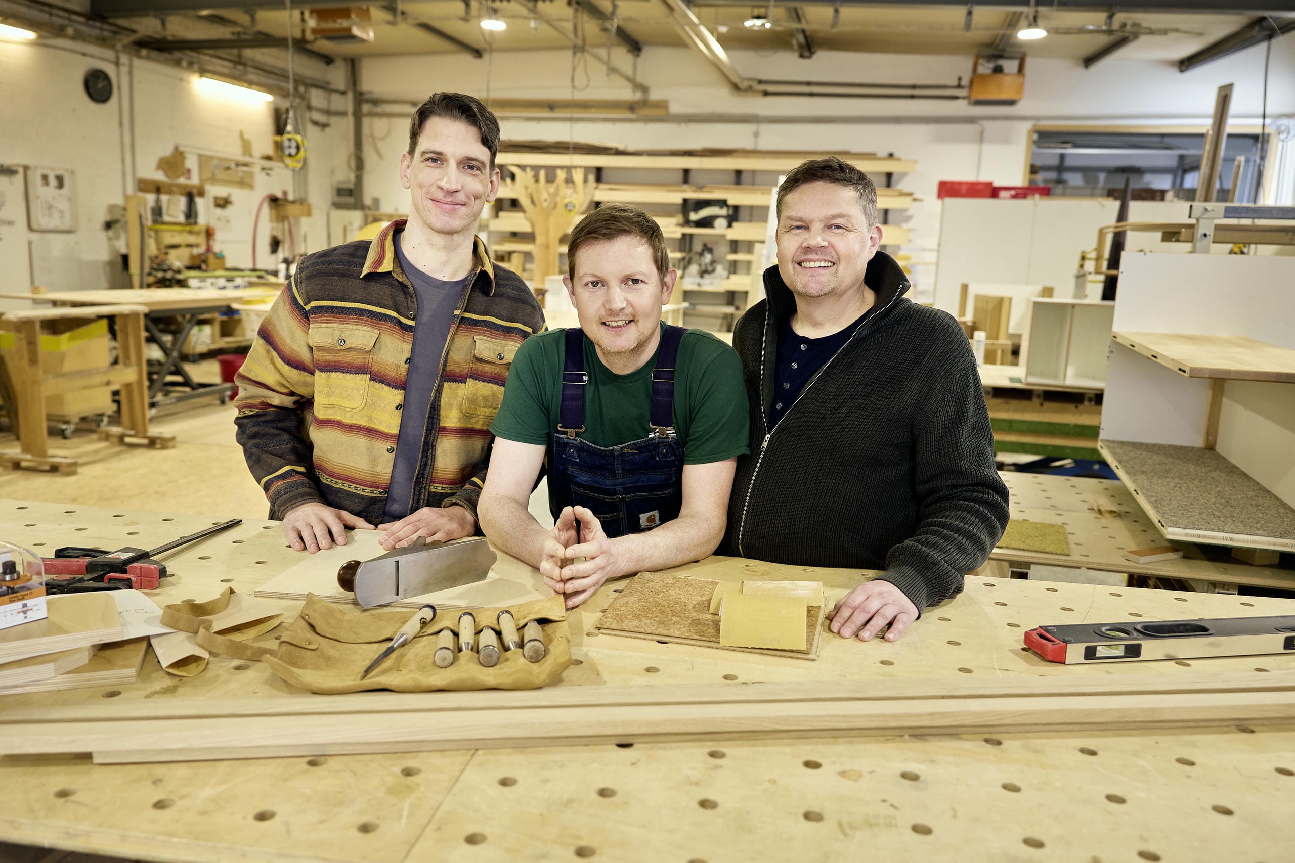 Drei Männer stehen lächelnd in einer Holzwerkstatt hinter einer Werkbank mit Werkzeugen; vor ihnen liegen Hobel, Stechbeitel und Holzproben, im Hintergrund sind Regale, Werkbänke und Holzelemente zu sehen.