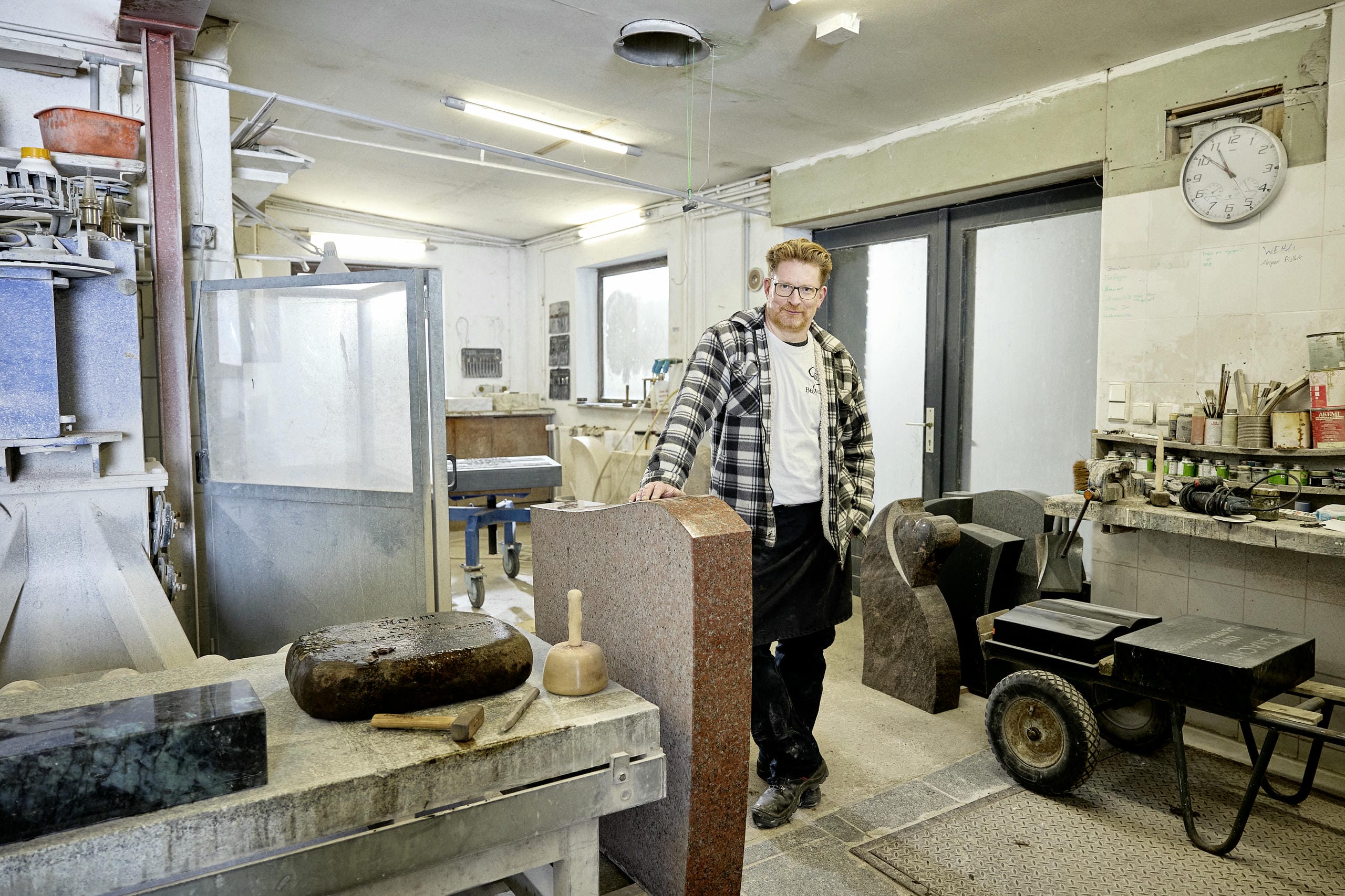 Ein Steinmetz steht in seiner Werkstatt neben einem roh bearbeiteten Grabstein aus rotem Granit. Um ihn herum liegen Werkzeuge, Steinblöcke und Maschinen zur Bearbeitung von Naturstein.